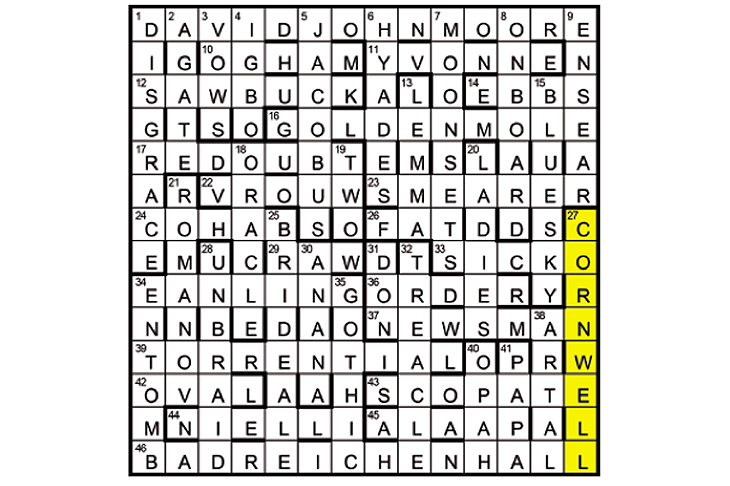On 19 October John le Carré turned eighty-eight (hinted at by TWO FAT LADIES (19/26/20)). His real forenames are DAVID JOHN MOORE (1A). The titles suggested were A Perfect Spy (GOLDEN MOLE: 16), The Looking Glass War (RAW: 29), A Small Town in Germany (BAD REICHENHALL: 46), The Russia House (ROMANOV: 21) and The Little Drummer Girl (the puzzle’s title). CORNWELL (27) was to be shaded.