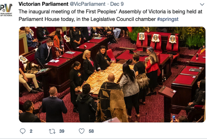 The venerable halls of the Victorian Legislative Council were decked with eucalyptus branches, wooden vessels and possum pelts adorned with the Assembly’s logo, the portraits of past Victorian statesmen looked on as their old seats were taken up by the 21 elected and 11 appointed members of the new, Aboriginal-only assembly.
