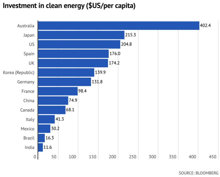 Moreover, Australia’s has assumed a “leadership” role in implementing energy price-boosting policies involving subsidies to bring about the replacement of low-cost dependable fossil fuel energy by high-cost intermittent renewables. Australia’s investment in “clean energy” is double that of our nearest kamikaze rival, Japan, and dwarfs that of the leading virtue signallers in the EU.