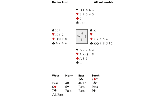 Bakhshi’s 2◆ shows both majors. East (Michael Byrne) bid 4NT to show both minors. Bakhshi’s 6♣was a cue bid (void) inviting his partner, Artur Malinowski, to bid 7♠. Artur judged that 6♠was the limit — but when West, Keiran Dyke, chose to sacrifice in 7♣, Artur passed instead of doubling — thus letting his partner know he had a little extra, and suggesting 7♠might be on — which Bakhshi duly bid and made!