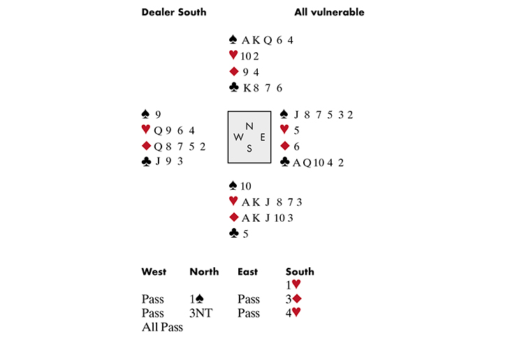 North’s final pass took some time — not surprising since he had quite a bit to spare. West started with the ♣3, won by East’s queen, and a Diamond was returned. Now what? With the valuable ♥10 and ♦9 in dummy, you really ought to lose no more than the two red queens and a Club trick, and yet 4♥was too high for two pairs in the strong field. Maybe they were distracted when dummy went down thinking they had missed slam.