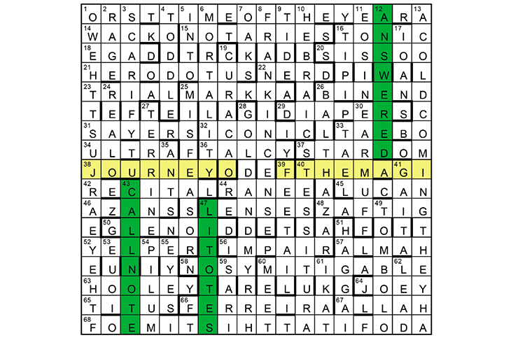The Journey of the Magi (38A and 39A), by T.S. Eliot, was based on an earlier sermon by Lancelot Andrewes, which is the source of the perimeter’s version of the quotation (starting ‘in the East’, down the right-hand column). His name appears in anagram form at 43D and 12D; and T.S. Eliot similarly at 47D —all three anagrams had to be highlighted. The magi’s gifts are shown in 8D and 28D.