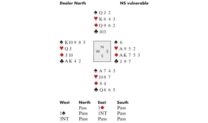 Nicola (South) led the ♣5. Declarer won with the ♣J and played a low diamond to dummy’s ◆J. Sarah (North) won the ◆Q and swiftly found the expert switch: the K. Declarer could still make the contract by ducking, but she won the ace and cashed ◆AK, hoping for a 3–3 split. Nicola threw a spade on the ◆K. Declarer now played a spade to the ♠K and then the ♠8. Sarah won and cashed the ◆9. Now Nicola found the discard to beat the contract: the A♠. Sarah exited in hearts. Declarer won and played another spade. Sarah won and played a heart to Nicola’s 10 for one off.