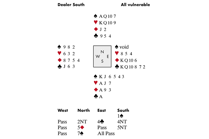 The annual Icelandic bridge tournament, held in Reykjavik at the end of January, is one of the best on the international circuit. Two days Pairs and two days Teams, it attracts players from all over the world, including the US. This year the most interesting ‘new pair’ was the Grossack brothers, Adam and Zach. In August Adam attained the rank of Grand Life Master at the remarkable age of 27, and the following day his younger brother Zach followed suit, making him the youngest GLM on record. They didn’t play together (both partnered sponsors) but, IMHO, they are destined to become one of the strongest partnerships in America, which means one of the strongest partnerships in the world. In the last round of the Pairs, today’s hand came up. Several pairs bid grand-slam, but only one pair made it. GLM the younger, ably assisted by me on lead! (see diagram)