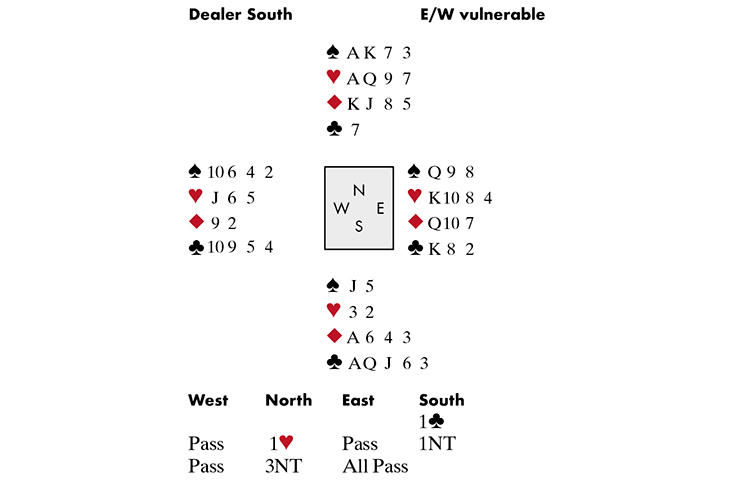 West led a small Spade, ducked to East’s Queen, who played a Spade back. A Diamond to the Jack lost to the Queen, East returning a Club to declarer’s Queen. A Heart to the Queen and King came next, and now East made the great play of a low Heart to break communications. West’s ♥J was taken by the Ace and declarer took stock. He recognised these 4–4 fits, and how to test the defenders. He led the ◆8 to his Ace, cashed the Ace of Clubs and played the ◆4 back to dummy’s King. When the ◆5 was led from dummy, with only two cards left, East froze; South had one more Diamond — he knew that — but which one? If dummy’s 5 was holding the trick, he must keep the master Heart, but if South is about to win it in hand, he must keep the ♣King. East got it wrong and Ankush made his precious overtrick./>