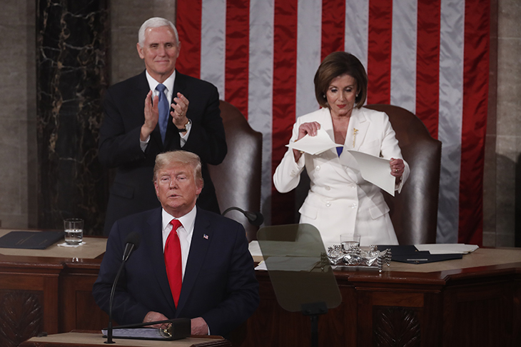 It’s easy to see why Trump might think that the Almighty is on side. Standing behind the President, Nancy Pelosi, the Democratic Speaker of the House, tore up her copy of Trump’s speech — an act that summed up her party’s impotent rage at his success. The video will be used in Republican attack ads for the rest of the year. The party of Pelosi feels cursed. The President just got impeached, yet it’s the Democrats who find themselves in hell.