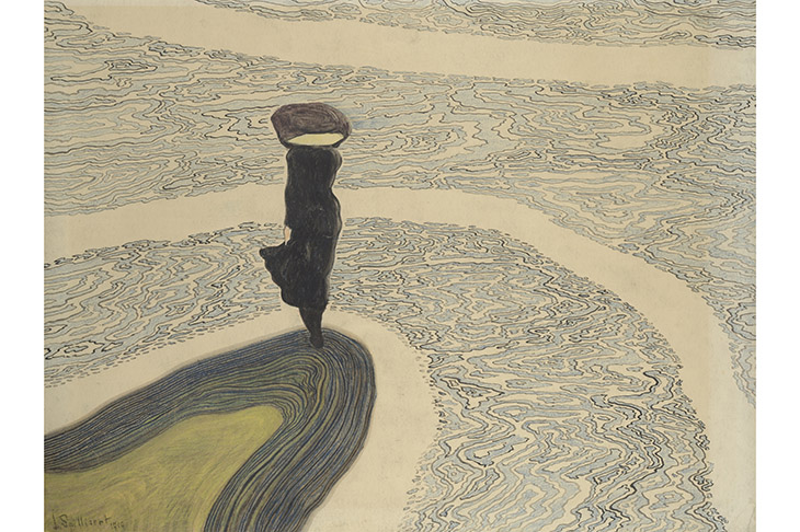 Spilliaert would often go for solitary walks along the promenade, and he looked down from his workplace on to the fisherman’s quay on the North Sea, which stretched to the horizon. The resulting pictures belong to a northern tradition, which includes Munch and Friedrich, of stark confrontation with a cold and infinite sea. Spilliaert’s seascapes such as ‘Breakwater with Pole’ or ‘Signal from the Pier’ (both 1907) are pared down to almost abstract geometry, and nearly monochromic. He also specialised in a genre you might call the spectral still-life. ‘Flasks’ (1909) is a drawing of three bottles on a shelf; it’s completely naturalistic, but somehow, perhaps because of its inky darkness, exudes an atmosphere of disquiet.