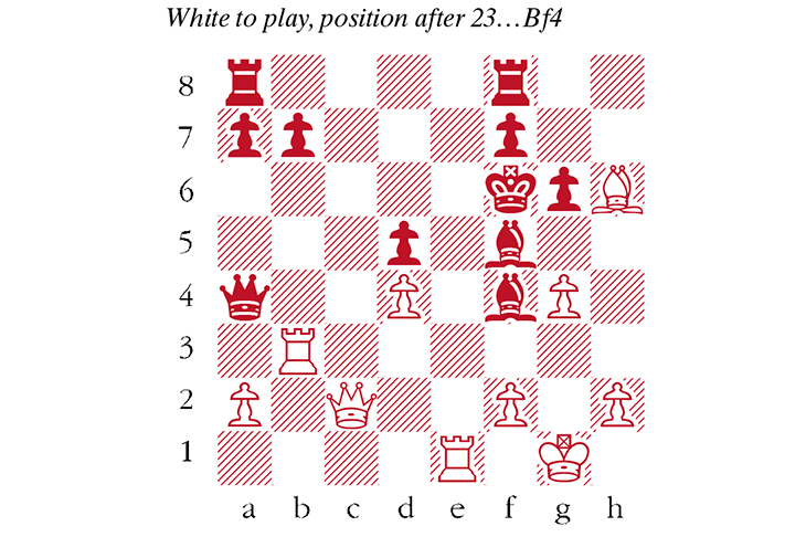 1 e4 e5 2 Nf3 Nf6 3 Nxe5 d6 4 Nf3 Nxe4 5 d4 d5 6 Bd3 Bd6 7 O-O O-O 8 c4 c6 9 Qb3 dxc4 10 Bxc4 Nd7 11 Re1 Ndf6 12 Nbd2 Nxd2 13 Bxd2 Qb6 14 Qd3 Qxb2 Consequent, but a move like 14… Bd7 was more prudent. 15 Rab1 Qa3 16 Qc2 Nd5 17 Rb3 Qa4 18 Bxd5! The start of a wonderful combination. 18… cxd5 19 Ng5 g6 20 Nxh7! Bf5 20… Kxh7 21 Rh3+! wins the queen on a4 21 Nf6+ Kg7 22 Bh6+! Luring Black’s king forward. 22… Kxf6 22… Kxh6 23 Rh3+ wins again. 23 g4!! What the hand, dare seize the fire? The lovely point is that 23…Bxc2 24 Rf3+ Bf5 25 g5 is mate. Instead, 23 Qd2 threatens mate on g5, but 23… Be4 blocks the e-file and the game remains complex. 23… Bf4! See diagram.