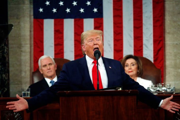 As for Trump himself, the prime-time televised speech was an opportunity to crow about his perceived accomplishments in an election year. Every sentence was a campaign slogan. “Jobs are booming.” “Our country is thriving and is highly respected again.” “In just the three short years, we have shattered the mentality of American decline.” Unemployment is at a record low. Seven million jobs have been created. America is producing more oil and gas than ever before. The Chinese are no longer eating America’s lunch on trade. Factories are being built. Corporations are bringing jobs back into the United States. And illegal immigrants with violent histories are being arrested and deported.
