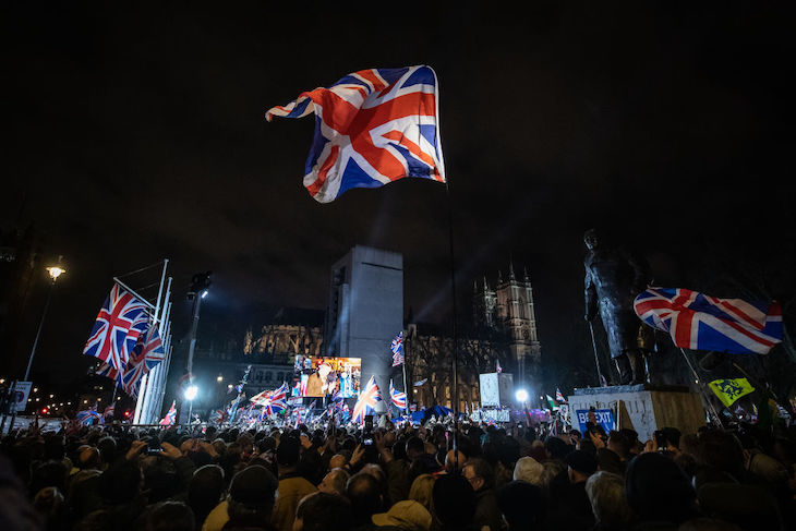 Remainers were there too. The first people I met at the Brexit Day festivities were opposed to the whole idea. I found them on Westminster Bridge, a man and his wife, posing with an EU flag. When the man spoke his voice faltered as if his pet spaniel had just died. ‘I married a German woman. I’ve been brought up to tolerate other cultures and lifestyles.’ I asked which of the many crises outlined by Project Fear would strike us first. ‘Economic slump,’ he said. Will Britain ever re-join? ‘Maybe in two generations.’