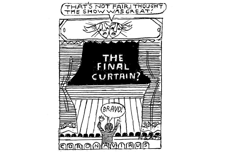 ‘Cancelled’ is quite a buzzword of our times, isn’t it? Up until about ten days ago, it referred mainly to cancel culture, that ability of Twitter mobs to rule on whether or not a celebrity misdemeanour means the end of celebrity for that celebrity. But recently someone tweeted me the words: ‘Nature: “I’ll show you cancel culture.”’ It’s true. Suddenly, the idea of the world ending — or at least, theatres, art galleries and musicals shut down for the foreseeable future — has lessened the trepidation felt by the targets of cancel culture. Which means the apocalypse may be accompanied by an outbreak of famous people with terrible views saying long bottled-up racist, sexist and transphobic things in a kind of ‘it doesn’t matter now — we’re all going down anyway’ rush.