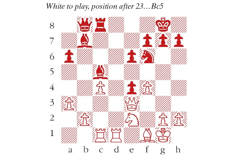 1 e4 c5 2 Nf3 e6 3 d4 cxd4 4 Nxd4 a6 5 c4 Qc7 6 Nc3 Nf6 7 a3 Be7 8 Be2 O-O 9 O-O d6 10 Be3 Nbd7 11 Rc1 b6 12 Qd2 Bb7 13 f3 Rac8 14 Rfd1 Rfe8 15 Bf1 Qb8 Black has set up a typical hedgehog formation. 16 Qf2 Ne5 17 Na4 d5!? A thematic break 18 Nxb6 dxe4 19 Nxc8 Rxc8 Black’s pieces bear down on White’s kingside from afar. One threat is 20…exf3 21 gxf3 Bxf3! 22 Nxf3 Nfg4! 20 f4 Neg4 21 Qg3 Bd6 22 Ne2 Nxe3 23 Qxe3 Bc5 (see diagram) 24 Nd4? Walking into an unshakeable pin. 24 Rd8+! was essential. 24… e5 25 fxe5 Qxe5 26 Be2 26 b4 Ng4! wins. 26… Rd8 27 Kh1 Bxd4 28 Qb3 Rb8 29 c5 Bxc5 30 Bxa6 Ng4 31 Qg3 Qxg3 32 hxg3 Nf2+ 33 Kh2 Bxa6 White resigns