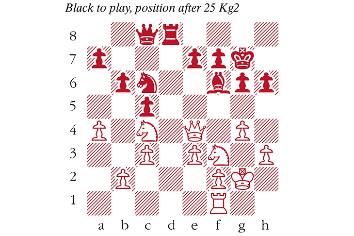 1 d4 Nf6 2 Nf3 g6 3 Bg5 Bg7 4 Nbd2 O-O 5 e3 d6 6 Bc4 c5 7 c3 Qc7 8 O-O Nc6 9 dxc5 dxc5 10 Qe2 Nh5 11 Rad1 b6 12 Bh4 Bb7 13 Ba6 Rad8 14 Bxb7 Qxb7 15 Nb3 h6 16 Qc4 Rd7 17 Rd2 Rxd2 18 Nbxd2 Rd8 19 g4 Nf6 20 h3 Nd7 21 Qe4 Qc8 22 a4 Nf6 23 Bxf6 Bxf6 24 Nc4 Kg7 25 Kg2 (see diagram) Qc7 26 h4 Kg8 27 Qf4 Qd7 28 Qe4 Bg7 29 g5 h5 30 Rc1 e6 31 Kf1 Qc7 32 Ke2 Ne7 33 Rd1 Rxd1 34 Kxd1 Qd7+ 35 Ncd2 Nf5 36 Ke2 Kh7 37 Qc4 Nd6 38 Qd3 Qc6 39 Nc4 Nf5 40 e4 Ne7 41 b3 Qc7 42 Ke3 Kg8 43 Qd6 Qxd6 44 Nxd6 Bxc3 45 Nb5 Bb2 46 Nxa17 f6 47 gxf6 Bxf6 48 Kd3 Bb2 49 Kc4 e5 50 Kb5 Bd4 51 Nc6 Nxc6 52 Kxc6 Bxf2 53 Nxe5 Bxh4 54 Nxg6 Bf2 55 Nf4 h4 56 e5 Be3 57 e6 A nice finishing touch, as 57…Bxf4 58 e7 Kf7 59 Kd7 forces the pawn through. Black resigns