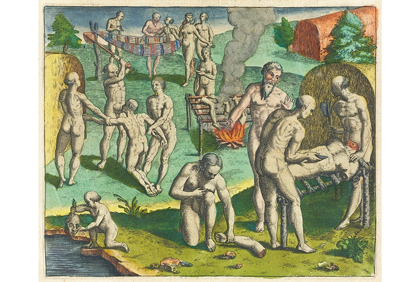 Strangely, the more hair-raising practices are depicted without judgement. Perhaps they felt it wasn’t necessary. The passages on child-sacrifice are all the more shocking for being so matter of fact. Cannibalism loomed large, especially in Volume III’s account of Hans Staden, a German gunner in the service of Portugal who ‘decided I would go and see the Indians’ and ended up almost literally in the soup. The story of his capture and imprisonment by the cannibalistic Tupinamba tribe in Brazil goes into graphic detail — TMI — about the wooden butt plug inserted into a victim’s rear prior to cooking ‘so that nothing escapes out of him’, and is illustrated with gruesome images of human body parts laid out on a grill. ‘I witnessed this myself,’ Staden insists. We’re not told how he lived to tell the tale.