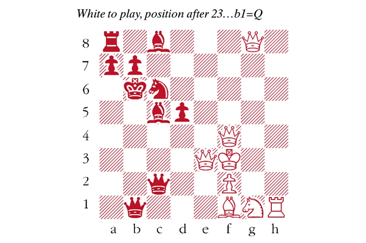 1 e4 e6 2 d4 d5 3 Nc3 Nf6 4 Bg5 Bb4 5 e5 h6 6 exf6 hxg5 7 fxg7 Rg8 8 h4 gxh4 9 Qg4 Be7 10 g3 c5 11 gxh4 cxd4 12 h5 dxc3 13 h6 cxb2 14 Rb1 Qa5+ 15 Ke2 Qxa2 16 h7 Qxb1 17 hxg8=Q+ Kd7 18 Qxf7 Qxc2+ 19 Kf3 Nc6 20 Qgxe6+ Kc7 21 Qf4+ Kb6 22 Qee3+ Bc5 23 g8=Q b1=Q (see diagram) 24 Rh6 Qxf1 25 Qb4+ Qb5 26 Qd8+ Ka6 27 Qea3+ Qca4 28 Qaxa4+ Qxa4 29 Qxa4 mate