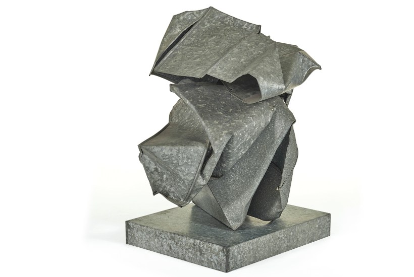 Crushed, Cast, Constructed at Grosvenor Hill contrasts three approaches to sculpture in the works of John Chamberlain, Urs Fischer and Charles Ray. The main space is occupied by three of Fischer’s massive silvery forms moulded from small lumps of clay kneaded, squeezed and twisted in the hand, then scaled up 50 times for casting in aluminium. The last time I saw examples of these tortured metal clumps magnifying the epidermal ridges on the artist’s palm to the size of ribs on a side of beef was in Paris in 2011, plonked down in the courtyard of the Rodin Museum beside ‘The Gates of Hell’. There is certainly something Rodinesque about the torsion of these inchoate forms, with their hints at human and animal shapes: a giant knee here, a protruding foot there, a nose, an ear, an eagle’s back, a sea lion’s snout. They’ve been compared to ancient rock formations, but no human hand can beat wind and weather at natural form. Despite their fancy tongue-in-cheek titles after Stéphane Mallarmé’s fashion magazine bylines, they are basically sculpture about sculpture.