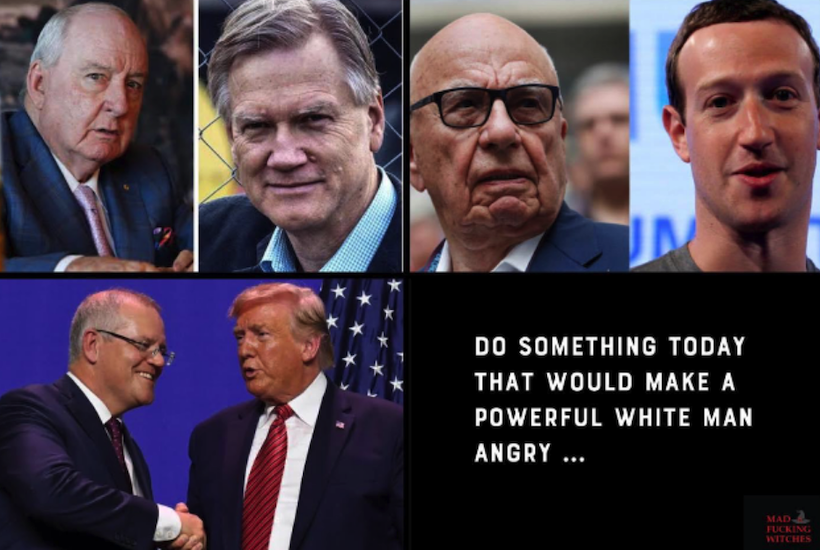 “Look at the men in the meme, witches,” the activist lunatics posted alongside an image featuring Alan Jones, Andrew Bolt, Rupert Murdoch, Mark Zuckerberg, Scott Morrison and Donald Trump. “Every face. Every expression. Every prick-faced c**tish sh*tlord in a suit. Every hateful f**king one of them.”