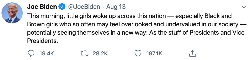 Yes. It was Biden who said, after selecting Harris as his running mate, that: “This morning, little girls woke up across this nation — especially Black and Brown girls who so often may feel overlooked and undervalued in our society — potentially seeing themselves in a new way: As the stuff of Presidents and Vice Presidents.”