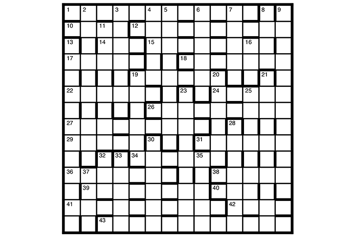 A first prize of £30 for the first correct solution opened on 21 September. There are two runners-up prizes of £20. Please note that until further notice entries should be clearly scanned or photographed and emailed (including usual details and the crossword number in the subject field) to crosswords@spectator.co.uk. We will go back to accepting postal entries in the fullness of time. Please allow six weeks for prize delivery.
