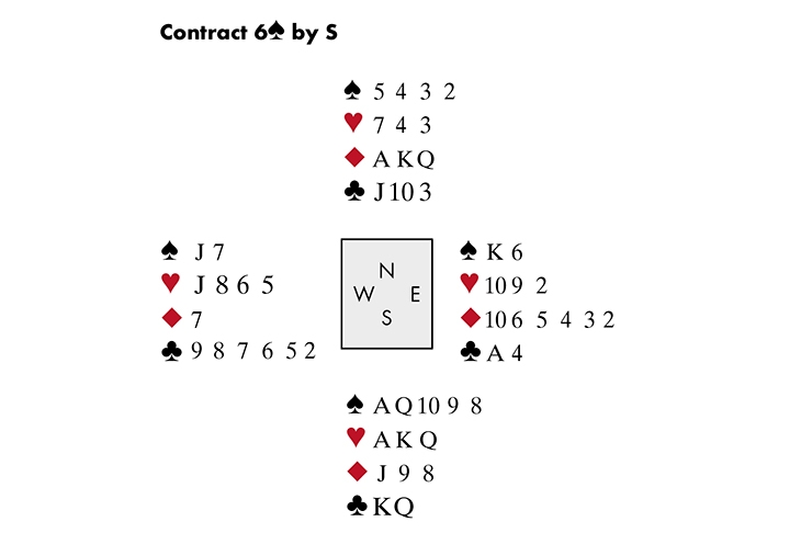 Neil led his singleton diamond. I won and played a spade to my ♠Q, whereupon Neil (who knew from the bidding I held five spades) dropped his ♠J! Not suspecting him of being so crafty, I assumed East had begun with ♠K76 and tried to cross to dummy’s ◆K to finesse again. Neil ruffed, and the expression on my face, he told me, was precisely why online bridge could never replace the real thing.