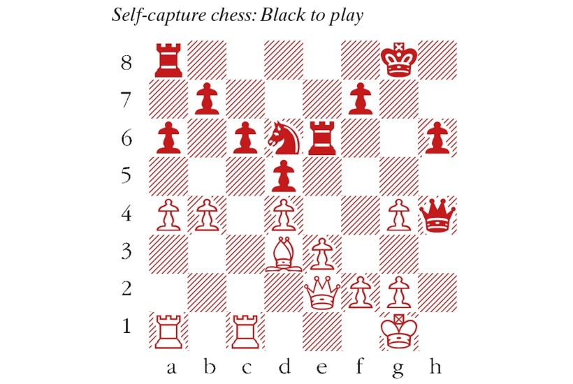 In ‘self-capture chess’ (another of nine intriguing variants examined by AlphaZero), players are permitted to capture their own pieces. In Kramnik’s words: ‘I would even go as far as to say that to me this is simply an improved version of regular chess’. That’s an extraordinary claim, particularly as the self-capture option means that many standard mating patterns no longer work. (For example, facing a smothered mate with a knight, the attacked king would just capture one of his obstructive comrades.) But new dynamic ideas arise in their place. In the endgame, advanced pawns can capture their own pieces to circumvent a blockade. Or take a look at the diagram, a sample self-capture game from the paper. If the pawn on h6 were absent, 1…Rh6 would be natural, threatening Qh4-h1 mate. In self-capture chess, the Black rook can capture its own pawn to play exactly that: 1…Rxh6! White blithely responded 2 Qf3, because after 2… Qh1+ comes another self-capture move 3 Kxf2! and the king slips away. The game continued 3…Qh4+ 4 Ke2 Re8 and ended in a draw after further adventures.