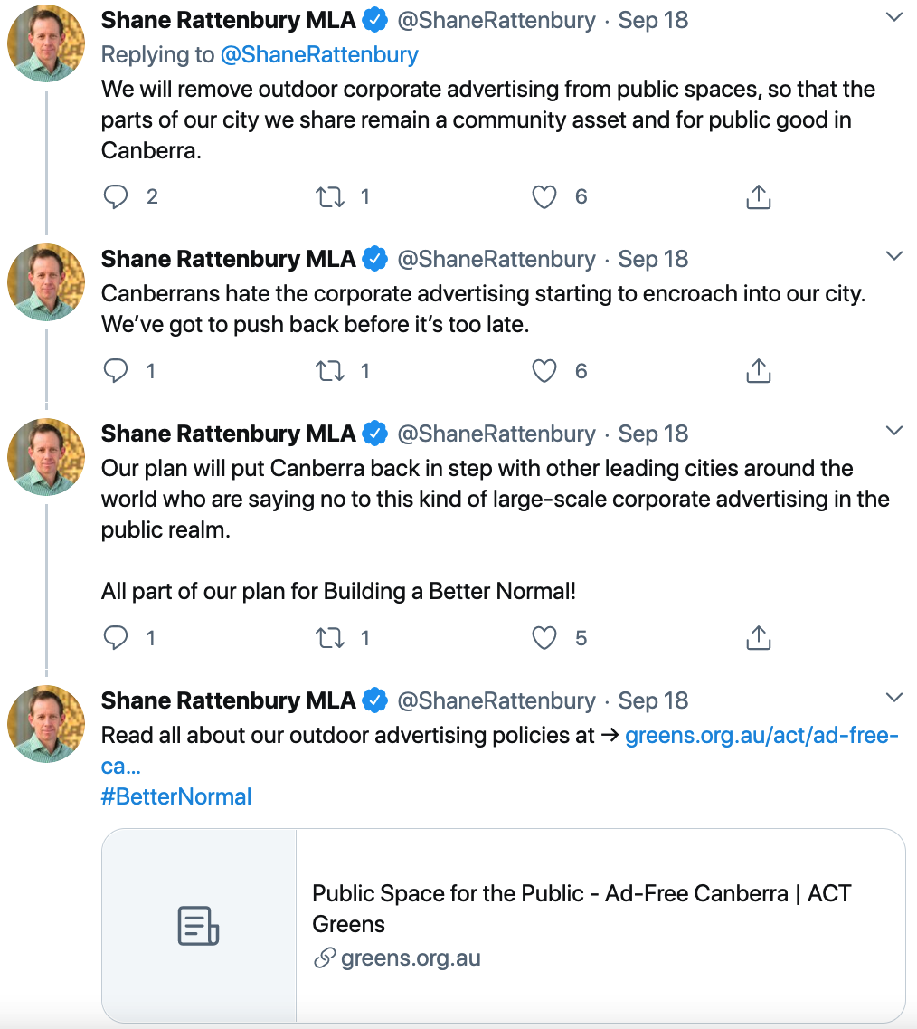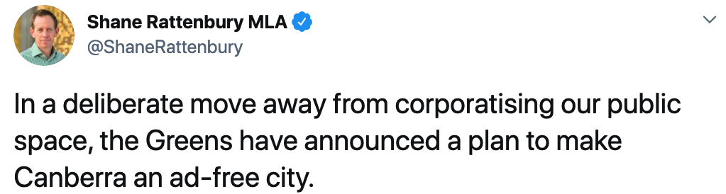 The Greens: billboards are evil. Shane Rattenbury MLA, Speaker of the Canberra City Council (AKA Legislative Assembly), Twitter, yesterday: