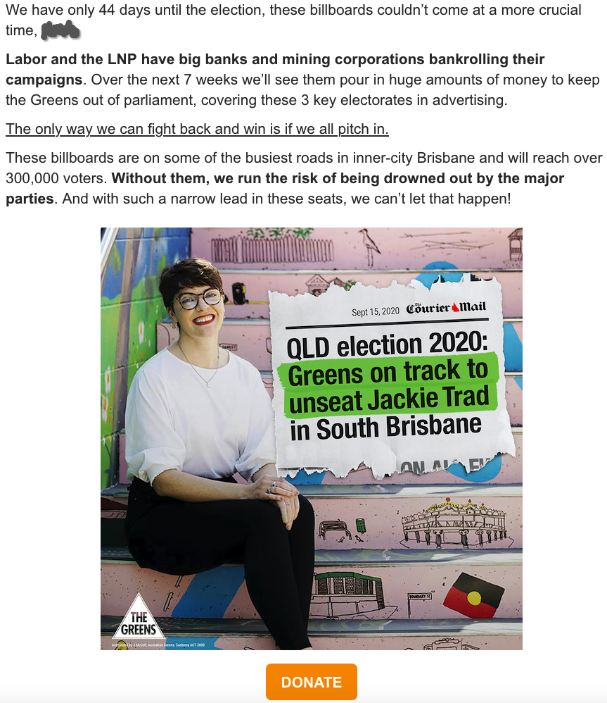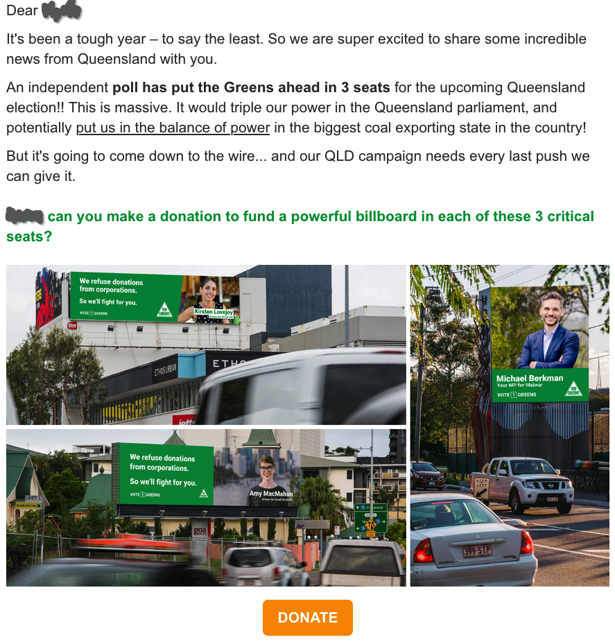 The Greens: please give us lots and lots of money for lots and lots of billboards everywhere. Begging email, today:
