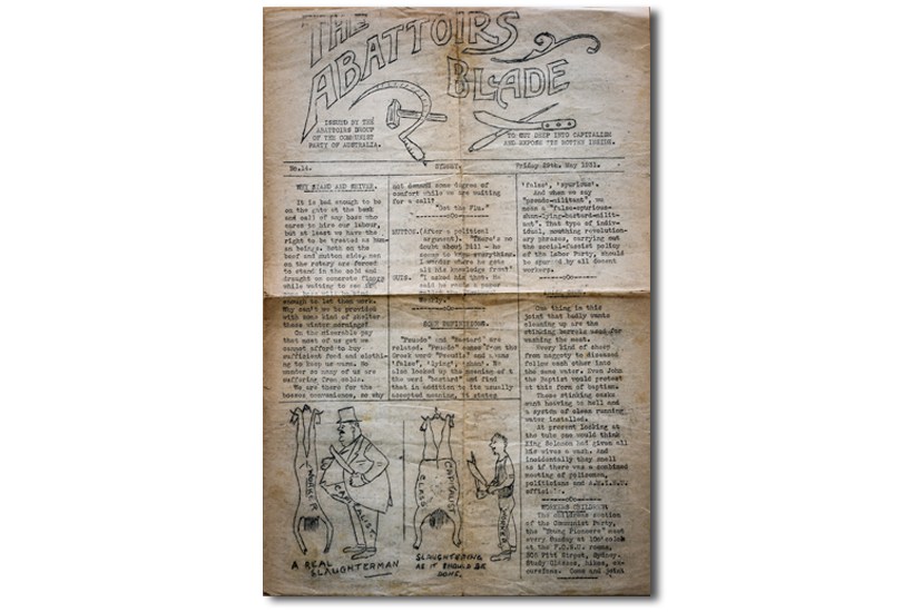According to newspaper reports, the Abattoirs Blade appears to have been produced and circulated by Homebush members of the Meat Employees Union. It was blacklisted by the union in 1931. The Sydney Morning Herald reported on 25 June, 1931 that ‘a mass meeting of employees at the abattoirs had unanimously denounced the Communist paper and declared it “black”.’ Unsurprisingly, the Workers Weekly’s report of the event on 19 June that same year was longer and more vivid. It concluded with these emphatic lines: Mr Hutt, immediately after he succeeded in having the ‘Blade’ declared black, can now boast that the Party worker who distributed the ‘Blade’ was arrested and was assured by the Police sergeant that if the ‘Abattoir Blade’ did not come out again no further action would be taken against him. Freddy Hutt, you will have to get more than the police to scare off the Communists, or the ‘Abattoir Blade.’ You will need more support than the whole of the social fascist crew combined can give you to prevent yourself from being sent back into the oblivion from which you came, and from which there will be no return.