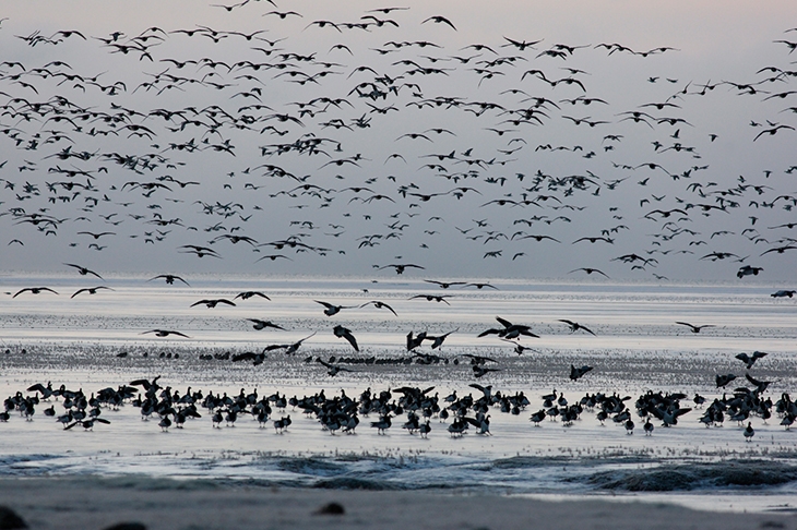 East Anglia is the place for birds. We wave the swallows goodbye, a pause, then the first skeins of geese come in rawking and cackling overhead, going between their inland feeding grounds and the marshes. Everything is flocking now, thousands of starlings doing their astonishing rising, swirling, falling, murmuration thing, dense black clouds in the evening sky, lapwings mass in ploughed fields and near Snape yesterday, we saw a great pack of snipe. We go to the mud flats at low tide, haunting, beautiful and empty, watch redshanks, oystercatchers, egrets and spoonbills pootle about stiff-legged, long beaks pecking sharply in and out the mud, for food. Skies are huge, cloud banks, shape-shifters, rearrange themselves constantly, silver grey, graphite, battleship, swan-white, and the sun goes down in all its garish glory, the moon rides slowly up the sky over the marshes. An owl cries. We head home.