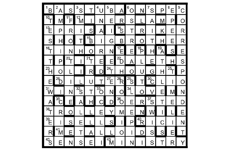 In George Orwell’s 1984 WINSTON SMITH (31/3) worked for the MINISTRY of TRUTH (43/21). The MINISTRY of LOVE (43/34) got him for THOUGHT CRIME (24/35) and sent him to ROOM 101 (28). He finally gave in to BIG BROTHER (15).