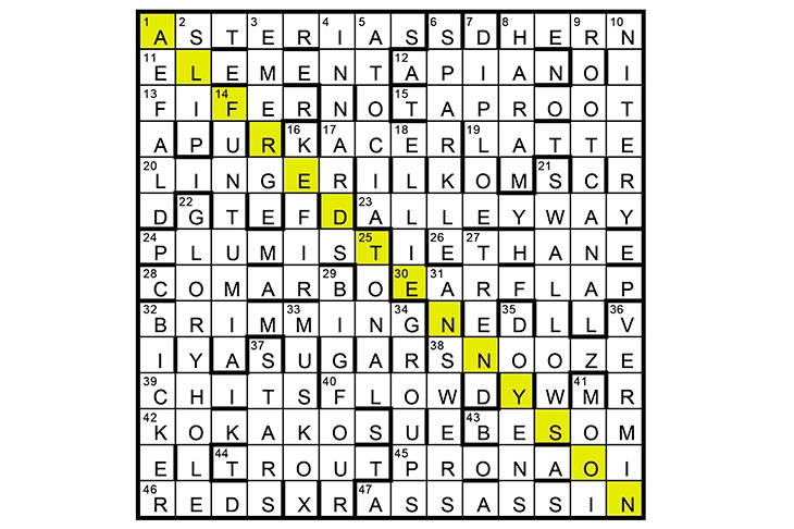 The poem was The Brook by Alfred Tennyson. The words were HERN (8A), LINGER (20), BRIMMING (32A), FLOW (40), TROUT (44), SLIP (2), SPARKLE (6), SWALLOWS (21), BICKER (32D) and STARS (37). ALFRED TENNYSON (diagonally from 1) was to be shaded.