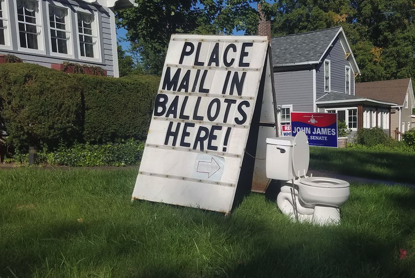 Everyone else had a good belly laugh at a local resident who, with tongue firmly in cheek, placed a toilet on her front lawn accompanied by a sandwich-board sign that read “Place mail in ballots here!”. But not Byron. According to an Associated Press story she was ‘concerned that the display could mislead people not familiar with the voting process’.