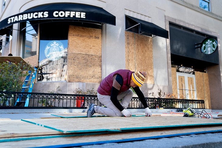 On election day in the capital there is no thrill in the air, but there is a sound: that of hardboard being placed over all of Washington’s windows. Wherever you go in the centre of town, the area is either boarded up or in the process of being so. I enjoy my sausage and eggs on a sidewalk to the accompaniment of the last windows being drilled. ‘Was everything all right?’ my waitress enquires. ‘Delicious,’ I tell her. ‘If the city is still here tomorrow, I’ll be back.’