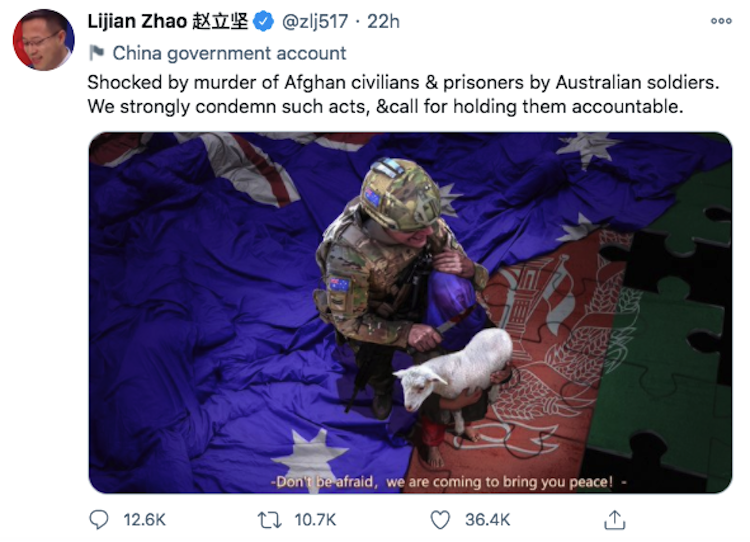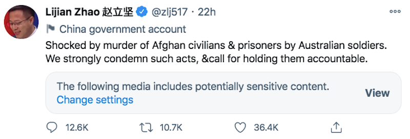 You leave it up — and just to round things off when there’s an international uproar over the fake, you still keep it up, but just whack a “sensitive” warning on the Tweet after the best part of a day?