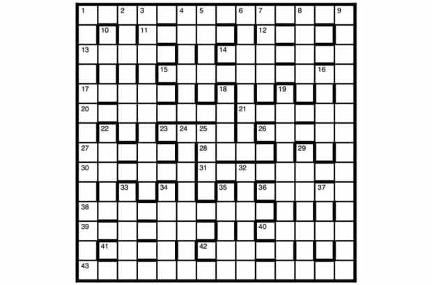 A first prize of £30 for the first correct solution opened on 15 February. There are two runners-up prizes of £20. Please scan or photograph entries and email them (including the crossword number in the subject field) to crosswords@spectator.co.uk – the dictionary prize is not available. We will accept postal entries again at some point. Apologies that there may be a delay in sending out prizes at present.
