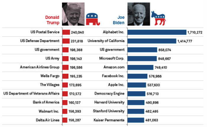 For example, the Biden campaign received $2.6 million from Eric Schmidt, the former executive chairman of Alphabet, the parent company of Google.