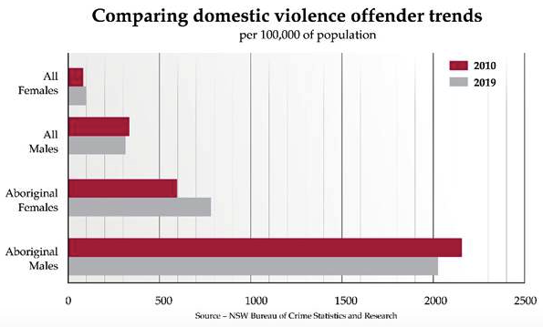 But even now, there are many Aboriginal communities with well-functioning families explains Bligh, taking issue with the feminist assumption parroted by WRA that domestic violence is evenly spread across society. It’s well documented that there are some Aboriginal communities, particularly in outback Australia, showing far higher levels of mental health problems, suicide, drug and alcohol usage and it is here that domestic violence levels go sky high. BOSCAR has a revealing map on their website comparing rates of domestic violence across the State – showing outback Australia with the highest levels of risk. NSW’s most troubled towns are Coonamble and Walgett where about a third of the population is indigenous.