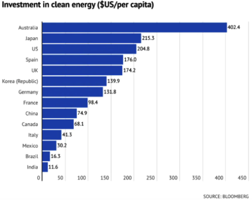 Yet the plethora of subsidies to renewables has led to Australia’s cannibalisation of investable income, thereby vastly outperforming other countries in its “clean energy” expenditure, as illustrated in the chart below.