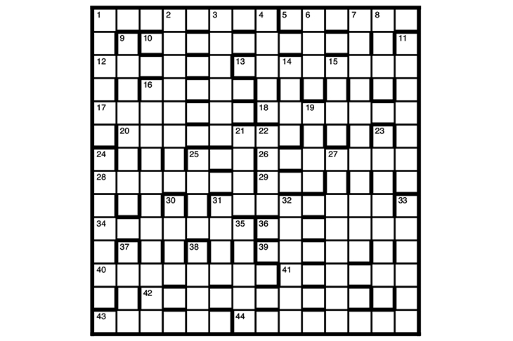 A first prize of £30 for the first correct solution opened on 15 March. There are two runners-up prizes of £20. Please scan or photograph entries and email them (including the crossword number in the subject field) to crosswords@spectator.co.uk – the dictionary prize is not available. We will accept postal entries again at some point. Apologies that there may be a delay in sending out prizes at present.