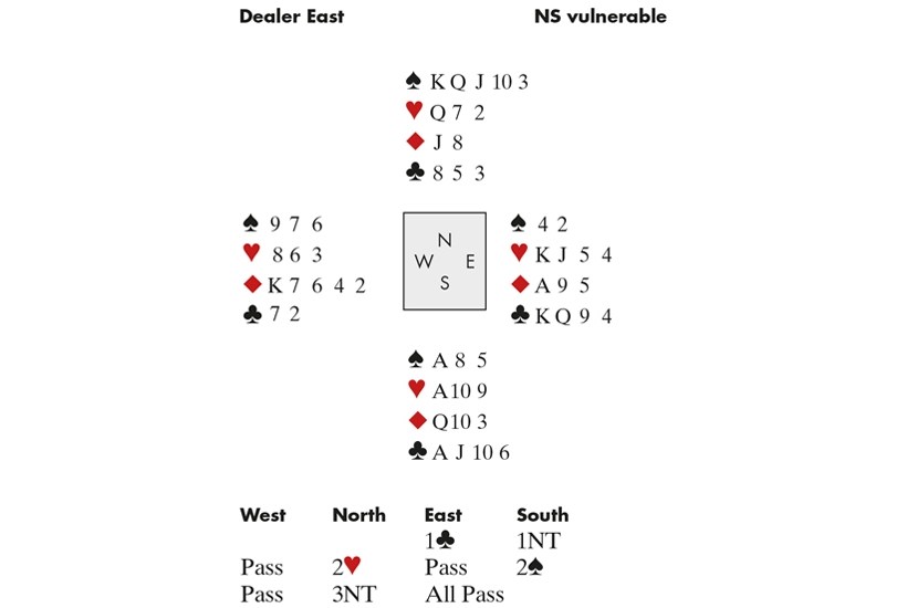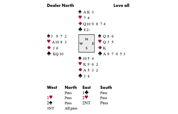 West led a Diamond to Martin’s Ace, and Declarer’s ◆10 held the next trick, which seemed to bemuse her a little. She played a Spade to the King and one back to the Ace, and then put the Queen of Diamonds on the table, covered by West’s King. ‘Ruff please,’ said South confidently, and there was a pause before everyone except Martin laughed. ‘There are no trumps in No-Trumps,’ said North helpfully. Declarer gulped, pulled herself together and said: ‘I had better discard a Club then.’
