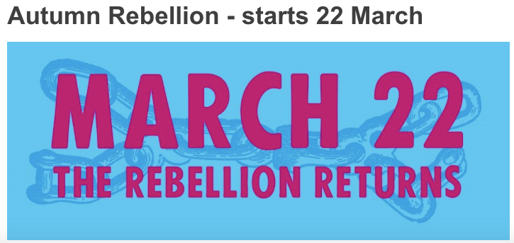 But another march is going ahead some than four weeks earlier. Indeed, a whole week of street protests and activity is planned — by Extinction Rebellion. They call it ” the big one”, declaring “we need everyone on the streets”, even telling supporters to “take time off work”.