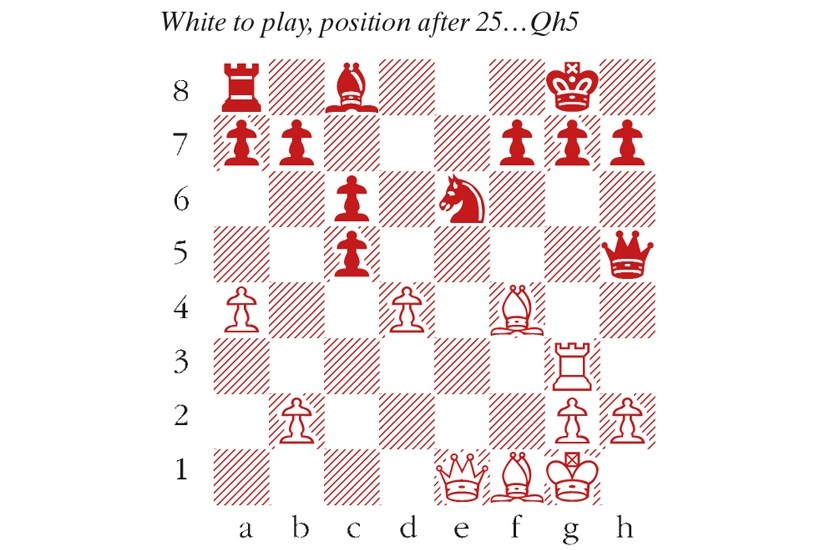 1 e4 e5 2 Nf3 Nc6 3 Bb5 Nf6 4 O-O Nxe4 5 Re1 Nd6 6 Nxe5 Be7 7 Bf1 Nxe5 8 Rxe5 O-O 9 Nc3 Ne8 10 Nd5 Bd6 11 Re1 c6 12 Ne3 Be7 13 c4 Nc7 14 Nf5 Bf6 15 Nd6 Bd4 16 Qg4 Qf6 17 Qg3 Bxf2+ 18 Qxf2 Qxd6 19 c5 Qg6 20 a4 With this imaginative rook deployment, White gets dangerous compensation for the sacrificed pawn. d6 21 Ra3 dxc5 22 d4 Re8 23 Bf4 Rxe1 24 Qxe1 Ne6 25 Rg3 Qh5 (see diagram) 26 d5!! A brilliant idea. cxd5 26…Nxf4 allows 27 Qe8 mate. Or 26…Qxd5 sees White forcibly open the e-file: 27 Rd3 Qh5 28 Rd8+ Nf8 29 Rxf8+ Kxf8 30 Bd6+ Kg8 31 Qe8 mate. 27 Rg5! Qh6 28 Rxd5 Qxf4 29 Rd8+ Nf8 29…Nxd8 30 Qe8# 30 Qe7 h5 30…Qd4+ 31 Rxd4 cxd4 32 Qe8! ties Black in knots. 31 Rxf8+ Kh7 32 Bd3+ Bf5 Black won’t last long after 32…f5 33 Qe8! Qd4+ 34 Kh1. 33 Bxf5+ Qxf5 34 Rxa8 Qb1+ 35 Kf2 Qxb2+ 36 Qe2 Once the checks run out, White’s extra rook mops up comfortably. Qd4+ 37 Kf1 Qa1+ 38 Qe1 Qxa4 39 Re8 f5 40 Re5 Qf4+ 41 Kg1 c4 42 Qe3 Qg4 43 h3 Qd1+ 44 Kh2 Qd6 45 Qf4 c3 46 Qxf5+ g6 47 Qe6 Qxe6 48 Rxe6 b5 49 Re7+ Kh6 50 Rxa7 b4 51 Rc7 Black resigns