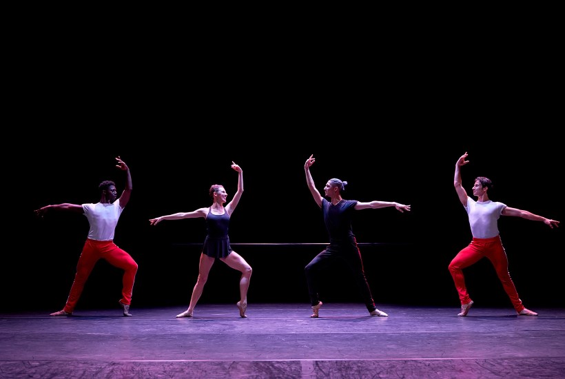 The last section is the beefiest, a leap-heavy quartet set to a throbbing backbeat (another Blake track, one of five that feature). Peck and Brooklyn Mack (formerly of Washington Ballet) step out for a salsa-inspired spin, the only point where the performance stumbles. Something about their flirty shimmies and her surprise costume change feels stilted (and weirdly reminiscent of the climactic ballet in Center Stage). But it’s not long before we’re back to the panache we started with. The final phrase is a joy: the dancers are teamed in twos, one pair framing the other as they prance forward and backward, the whole thing crafted in pleasing symmetry. Their bounding steps, delivered with playful glances, recall Playlist (Track 1, 2), a springy crowd-pleaser Forsythe choreographed for English National Ballet in 2018.