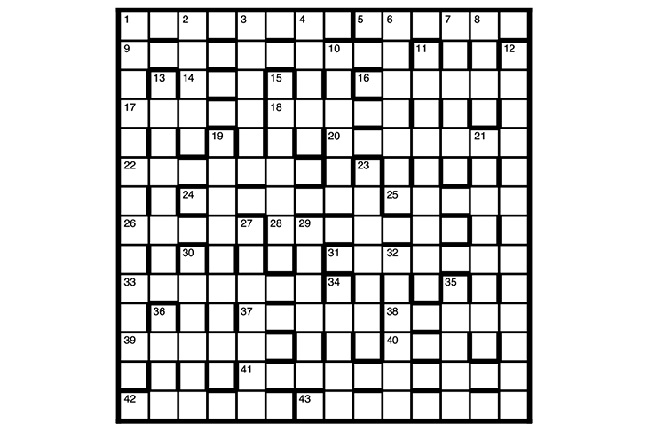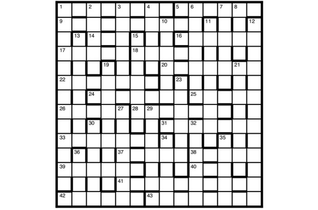 A first prize of £30 for the first correct solution opened on 7 June. There are two runners-up prizes of £20. Please scan or photograph entries and email them (including the crossword number in the subject field) to crosswords@spectator.co.uk – the dictionary prize is not available. We will accept postal entries again at some point.