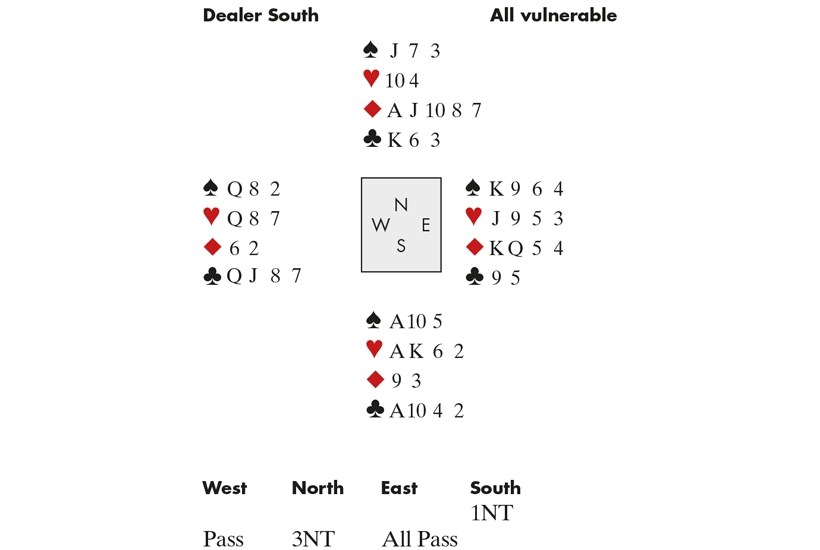 The auction and contract were the same in both rooms. The English declarer received a small Club lead, won cheaply with the ten. The ◆9 was allowed to run to East, who shifted to a Heart. South took that, lost another Diamond to East but had nine tricks: three Diamonds, three Clubs and Ace, King Ace.