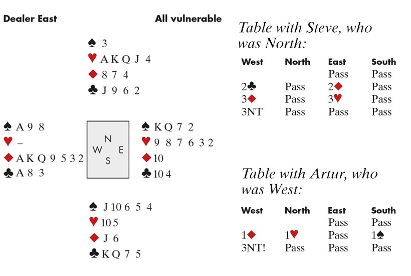 It’s not often you jump to 3NT with a void in an opponent’s suit. But again, Artur’s bid was well-considered: South hadn’t supported hearts so maybe East had a stopper; and besides, North might lead his partner’s suit. North cashed his four top hearts, and Artur claimed the rest.