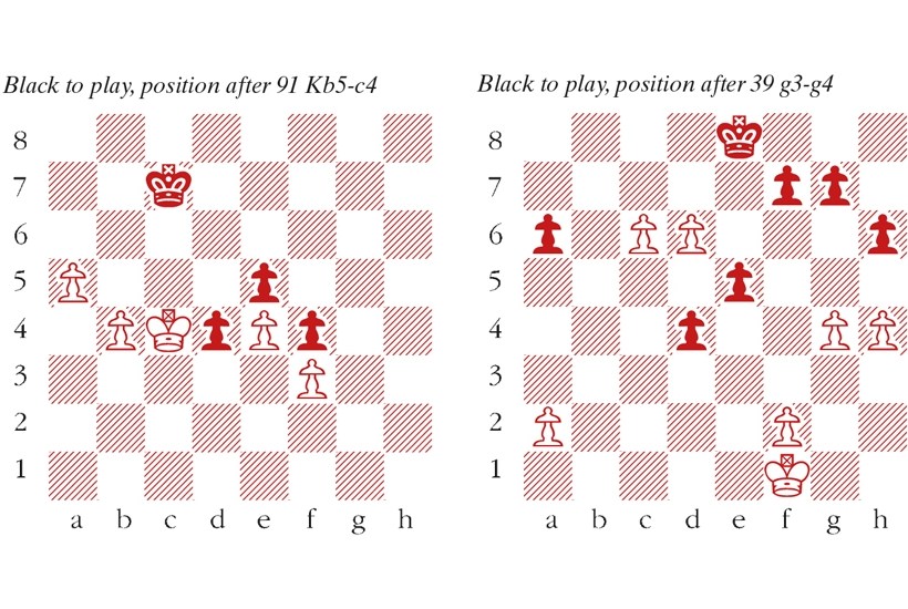 An exciting situation occurred last month (see diagram 2, Black to play). Imagine sweeping away all the f, g and h pawns: the position is then drawn. Black will place pawns on e4 and d3, so that a bolt forward with the White king (as in the previous example) would be too slow. However, if Black plays 39…e4 in the diagram, White has a methodical winning plan, making use of the f2-pawn. First, 40 h5! to fix the kingside pawns, so if Black ever ventures …g7-g6, the response g4-g5! will engineer a decisive passed h-pawn. Next, trundle the king round to b3 and c4, and back to c3 when Black advances d4-d3. (White must be sure to meet …a7-a5 with a2-a4, to retain access to the b3-square). Finally, dismantle Black’s e4-d3 mini pawn-chain with f2-f3. Instead, Black could start with 39…g6. But then 40 g5! nails down the f7-pawn, and the same plan can be enacted. An alternative defensive idea is 39…f6, since the g7-f6-e5-d4 pawn chain can never be undermined. But it is too far back, so White has a win in the style of Potter-Zukertort, e.g. 40 h5 Kd8 41 f3 Kc8 42 Ke2 Kd8 43 Kd3 Kc8 44 Kc4 Kd8 45 Kc5! d3 46 Kb6 d2 47 Kb7 d1=Q 48 c7+ Kd7 49 c8=Q+ Kxd6 50 Qd8+ with a decisive skewer. Dominguez took just seconds to play the only drawing move. He played 39…h5!!, aiming for a safe connected trio f5/e4/d3. If 40 g5 f5! 40 gxf6 (en passant) gxf6 41 Ke2 e4! is just in time, with f6-f5 to follow. Or 40 f3 hxg4 41 fxg4 e4 and the pawn duo is safe. Le tried a clever idea, 40 Ke2. Now if Black tries to win, he actually loses, e.g. 40…hxg4 41 Kd3 Kd8 42 Kc4 Kc8 43 c7 f5? (Black must not allow a future Kd5-e6). 44 Kc5 Kb7 45 Kd5 d3 46 Ke6 d2 47 Kd7 d1=Q 48 c8=Q+ and the d6 pawn will soon win the game. Dominguez wisely ignored the bait, and after 40…e4 41 gxh5 f5 42 f4 d3+ 43 Ke3 Kd8 it was Draw agreed a few moves later.