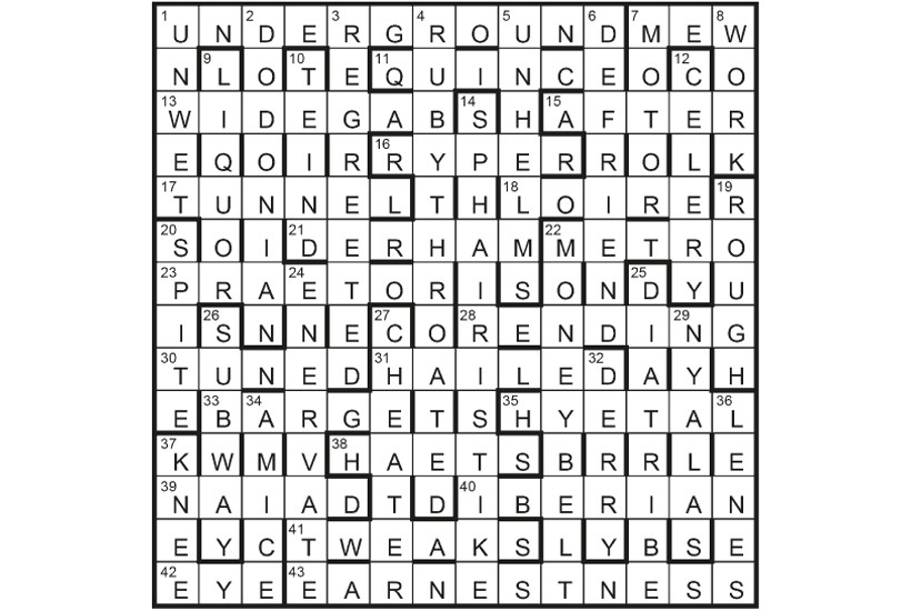 The traditional county towns were Chester (misprinted as CHEATER: 27), Durham (DERHAM: 21), Derby (DERRY: 32), Lewes (LENES: 36), Reading (RENDING: 28) and York (WORK: 8). The correct letters could give SUBWAY (26), examples of which are UNDERGROUND (1A), TUNNEL (17) and METRO (22A). Title: ‘Appleby’ misprinted.
