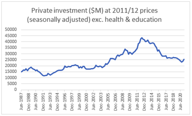 If the increase in manufacturing investment was to be welcomed, it also has to be recognised as a cherry on a paper maché ice cream. In aggregate terms, the value of new private investment in the March quarter 2021 was just one per cent above that of a year earlier. And, though the December 2020 to March 2021 quarter-on-quarter 6.3 per cent increase could be described as an annualised rate of 25 per cent, doubtless Treasury realised that such a number is unsustainable and offering it presented far too great a hostage to fortune.