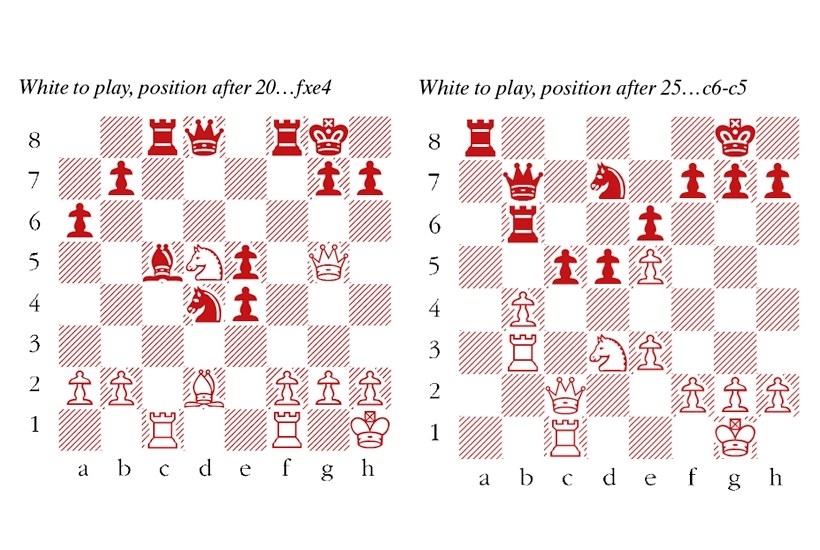 Carlsen has just grabbed a pawn on e4, so the knight on d5 lacks support. The simple 21 Nc3 looks roughly equal, but Dubov launched a volley of tactics with 21 Qxe5. His idea was revealed after 21…Rf5 22 Qxd4 Bxd4 23 Rxc8, because after 23…Qxc8 24 Ne7+ White emerges a knight up. So Carlsen chose 23…Rxd5 24 Rxd8+ Rxd8 which at first sight looks like a quiescent equality. On closer inspection, White is in trouble, and one can pin the blame on back-rank mating ideas. For example, 25 Bc1 Bxf2! is disastrous, since e4-e3-e2 is coming, and 26 Rxf2? loses to Rd1+. Even nastier is 25 b3 Bxf2! 26 Rxf2 e3! 27 Bxe3 Rd1+ and wins. Dubov opted for a lesser evil with 25 g3 Bxb2 26 Bf4, but Carlsen smoothly converted the extra pawn: 26…b5 27 Re1 Rd4 28 Kg2 Rc4 29 Rd1 Bf6 30 Rd2 Kf7 31 g4 Bd4 32 Re2 Bc5 33 Rd2 Ke6 34 h4 a5 35 h5 a4 36 h6 gxh6 37 Bxh6 b4 38 Bf4 b3 39 axb3 axb3 40 Rb2 Rc3 41 Rb1 Kd5 White resigns